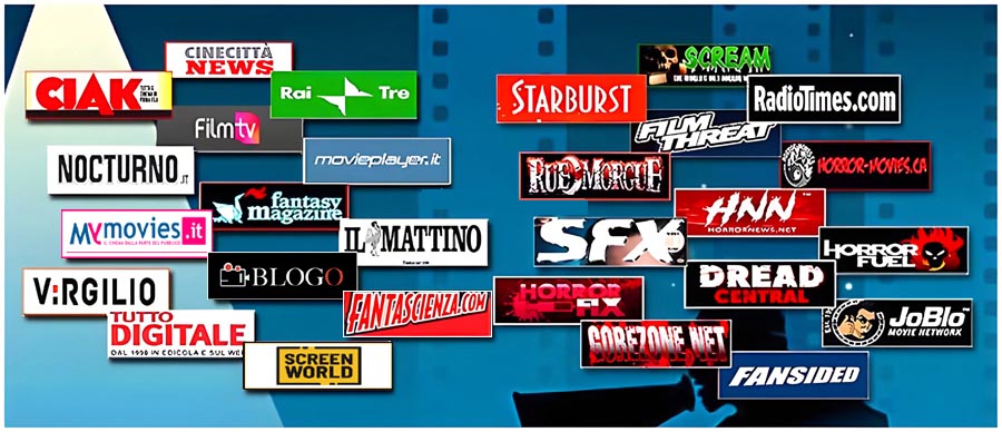 (Italiani: Ciak, Movieplayer, MyMovies, Cineblog, Screen World, Passione Cinema, The Sound Check, Il Mattino, Film TV, Nocturno Cinema, Fantascienza com, Cinecittà News, VideoMakers, Tutto Digitale, Horror Magazine, Fantasy Magazine, Taxi Drivers, Mucchio Selvaggio, News Cinema, Letteratura Horror, Cinemonitor, Horror Italia, Kinemazone, Ingenerecinema, Terza Pagina, Mondo Spettacolo, Cinema Italiano info, TheWalk of Fame, Cinevagabondo, Fare Film, La Zona Morta, Il Dogville, Cineocchio, La Città, I Moviez, Cinevatar, Inside the Show, Terre di Confine, Scheletri, Cineclandestino, Tutto Tek, Al di là del Cinema, Social Up, In Veritas Press, Sentieri Selvaggi, Nerdream, Project Nerd, Nerd Games, Cup of Green Tea, Club Ghost, Cinemaniaco, Recensioni a Go Go, Movie Tele, Through The Black Hole, Jamovie, Live Journal, Pills of Movies, Uno Notizie, Diamante TV, Cinemondium, UozzArt, Cinemio, Blasting News, Free Online, Geek Pizza, Fantasticinema, Elastic Media News, Cinemaniaco, Sardegna Reporter, Corriere di Sicilia, Salerno Today, Gazzetta della Lombardia, Roma City, Sicilia Oggi, Roma City Rumors, Notizie in un Click, Corriere di Napoli, Cilento Notizie, Abruzzo Oggi, Salerno Notizie, Gazzetta di Salerno ecc.