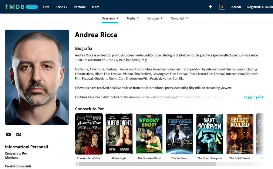 Andrea Ricca (leggi qui la biografia su MyMovies e la scheda personale su Google) regista e produttore, specializzato in grafica 3D e collaboratore del Giffoni Film Festival, partendo dalla realizzazione di film indipendenti, ha realizzato, nell'arco di circa venticinque anni, dal 1998, un ecosistema multimediale attorno al suo brand: "Andrea Ricca Presents", composto da produzione cinematografica, distribuzione negli Stati Uniti su Amazon Prime e in Italia con Minerva Pictures, la produzione di un libro sugli effetti speciali, una sezione di recensioni e tutorial e la presenza nei Festival cinematografici di tutto il mondo. Il tutto raccolto nel sito: www.andrearicca.it, che nel tempo ha attirato oltre cinquanta milioni di spettatori in streaming e recensioni positive da parte della stampa italiana e internazionale, oltre ad apparire in tesi di laurea e libri sul cinema che ne ha parlato come uno dei massimi esperti italiani di cinema digitale e indipendente.